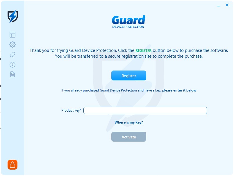 The wizard will take you through registration process, during which Guard Device Protection will show pop-up screen with an activation code box.